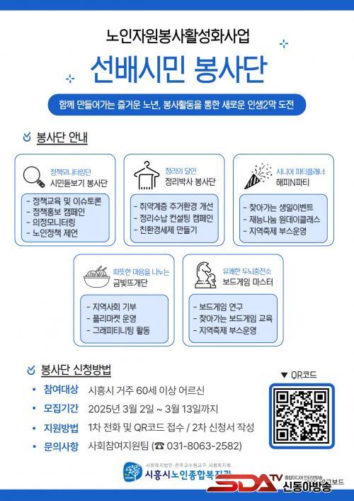 ºÀ»ç´Ü ÀοøÀº ÃÑ 10¸íÀ» ¼±Á¤ÇÒ °èȹÀ¸·Î, ¸ðÁý ±â°£Àº 3¿ù 13ÀϱîÁö´Ù. ½ÅûÀº ½ÃÈï½Ã³ëÀÎÁ¾ÇÕº¹Áö°ü »çȸÂü¿©Áö¿øÆÀ(031-8063-2582)À¸·Î ÀüÈ­Çϰųª È«º¸ Æ÷½ºÅÍÀÇ Á¤º¸¹«´Ì(Å¥¾ËÄÚµå)¸¦ ÅëÇØ ÇÏ¸é µÈ´Ù.