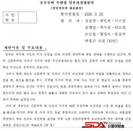 ¸ÕÀú, ¡¸°ø°øÁÖÅÃÆ¯º°¹ý¡¹°³Á¤¾ÈÀº ¡ã½ÅÈ¥ºÎºÎ ÁÖÅðø±Þ ±âÁØ¿¡ È¥ÀÎÀ², Ãâ»êÀ², Áö¿ªº° Áְźñ ¼öÁØ µîÀ» º¸´Ù ¼¼ºÐÈ­ÇÏ¿© ¹Ý¿µÇϵµ·Ï Çϰí, ¡ãÁ¤ºÎ°¡ °ø±Þ ±âÁذú ½ÇÀûÀ» ±¹È¸¿¡ º¸°íÇϵµ·Ï Àǹ«È­Çß´Ù. ½ÅÈ¥ºÎºÎ ÁÖ°Å Áö¿ø Á¦µµ°¡ Çö½ÇÀ» Á¦´ë·Î ¹Ý¿µÇϰí ÀÖ´ÂÁö ±¹È¸°¡ Áö¼ÓÀûÀ¸·Î Á¡°ËÇÒ ¼ö ÀÖµµ·Ï Çϰڴٴ ÃëÁö´Ù.