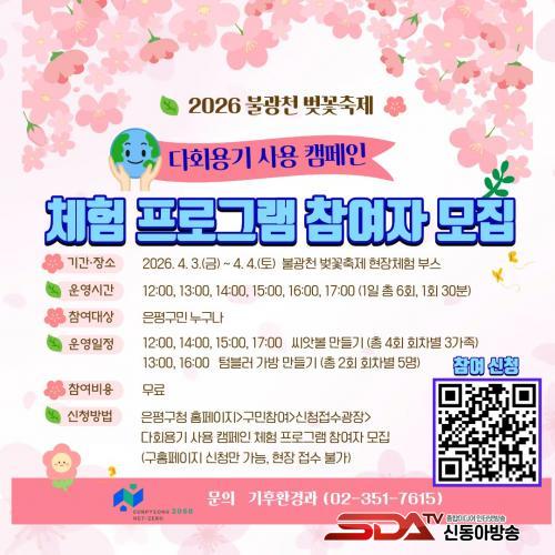 ¸ðµç üÇè ÇÁ·Î±×·¥Àº ÀºÆò±¸Ã» ´©¸®Áý ±¸¹ÎÂü¿©-½ÅûÁ¢¼ö±¤Àå¿¡¼ »çÀü ½ÅûÀ» ÅëÇØ Âü¿©ÇÒ ¼ö ÀÖ´Ù. Âü¿©ÀÚ ¸ðÁý ±â°£Àº 4¿ù 2ÀϱîÁöÀ̸ç, ÃÑ 100¸íÀ» ¼±Âø¼ø ¸ðÁýÇÑ´Ù.