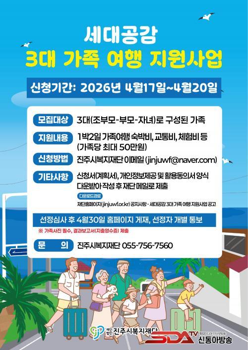 ½Åû Á¢¼ö´Â ¿À´Â 17ÀϺÎÅÍ 20ÀϱîÁö 4Àϰ£ ÁøÇàµÈ´Ù. ÁøÁֽú¹ÁöÀç´ÜÀº ½Åû °¡Á·À» ´ë»óÀ¸·Î ½ÉÀÇÀ§¿øÈ¸ ½É»ç¸¦ °ÅÃÄ ÃÖÁ¾ Âü¿© °¡Á·À» ¼±Á¤ÇÒ ¿¹Á¤À̸ç, ¼±Á¤µÈ °¡Á·¿¡°Ô´Â ¼÷¹Úºñ, ±³Åëºñ, ¹®È üÇèºñ µîÀÇ ¿©Çà °æºñ°¡ Áö¿øµÈ´Ù.