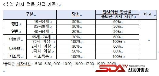 ¿ì¼± 4¿ù 1ÀϺÎÅÍ 6°³¿ù°£ ½ÃÂ÷ ÃâÅð±Ù* ½Ã°£´ë(¿ÀÀü 5½Ã 30ºÐ~6½Ã 30ºÐ, 9½Ã~10½Ã / ¿ÀÈÄ 4½Ã~5½Ã, 7½Ã~8½Ã)¿¡ ´ëÁß±³ÅëÀ» ÀÌ¿ëÇÏ¸é ¡®ÄÉÀÌ(K)-ÆÐ½º¡¯ ȯ±Þ·üÀÌ ±âÁ¸ ´ëºñ ÃÖ´ë 30%p »óÇâ Àû¿ëµÈ´Ù. ÀÌ¿¡ µû¶ó ÀÏ¹Ý 50%, û³â¡¤¾î¸£½Å¡¤´ÙÀÚ³à ºÎ¸ð 60%, 3ÀÚ³à ÀÌ»ó ºÎ¸ð 80% ¼öÁرîÁö ȯ±Þ¹ÞÀ» ¼ö ÀÖ´Ù. Àú¼ÒµæÃþ°ú 75¼¼ ÀÌ»ó ¾î¸£½ÅÀº ½ÃÂ÷ ÃâÅð±Ù ½Ã°£´ë¿Í »ó°ü¾øÀÌ °æ³²ÆÐ½º·Î 100% ȯ±ÞµÈ´Ù.