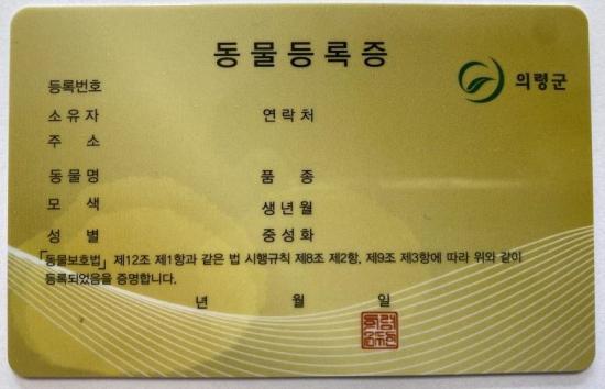 Ä«µåÇü µ¿¹° µî·ÏÁõÀº Áֹεî·ÏÁõ°ú °°Àº Å©±â·Î Á¦ÀÛµÇ¾î ±âÁ¸ Á¾ÀÌ µî·ÏÁõº¸´Ù ÈÞ´ë¿Í º¸°üÀÌ ¿ëÀÌÇϰí, µî·Ï¹øÈ£¿Í ¼ÒÀ¯ÀÚ Á¤º¸ µîÀÌ ±â·ÏµÇ¾î ÀÖ¾î Ȱ¿ëµµ°¡ ³ô´Ù.