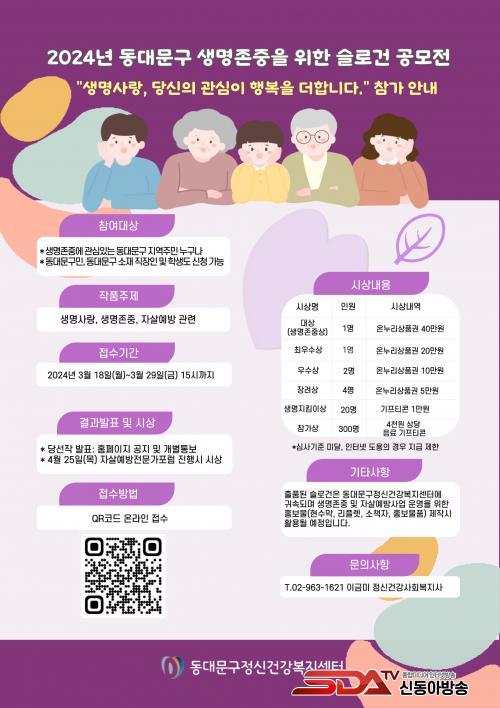Á¢¼ö ±â°£Àº 3¿ù 29ÀϱîÁö·Î, µ¿´ë¹®±¸Á¤½Å°Ç°º¹Áö¼¾ÅÍ ´©¸®ÁýÀ̳ª Æ÷½ºÅÍ¿¡ °Ô½ÃµÈ QRÄÚµå·Î Á¢¼öÇÏ¸é µÈ´Ù.
