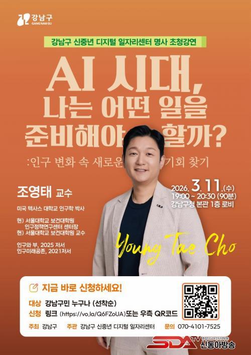 [½Åµ¿¾Æ¹æ¼Û °­³²±¸=À̽ŵ¿±âÀÚ] ²ÞÀÌ ¸ðÀÌ´Â µµ½Ã, ¹Ì·¡¸¦ ±×¸®´Â °­³²±¸°¡ ÀΰøÁö´É(AI) È®»ê°ú Àα¸±¸Á¶ º¯È­°¡ µ¿½Ã¿¡ ¸ô°í ¿À´Â ÀÏÀÚ¸® ÀçÆí¿¡ ´ëÀÀÇϱâ À§ÇØ ½ÅÁ߳⠴ë»ó ¸í»ç Ư°­À» ¿¬´Ù. 3¿ù 11ÀÏ ¿ÀÈÄ 7½ÃºÎÅÍ 8½Ã 30ºÐ±îÁö ±¸Ã» º»°ü 1Ãþ ·Îºñ¿¡¼­ ¡®AI ½Ã´ë, ³ª´Â ¾î¶² ÀÏÀ» ÁغñÇØ¾ß ÇÒ±î?: Àα¸º¯È­ ¼Ó »õ·Î¿î ±âȸ ã±â¡¯¸¦ ÁÖÁ¦·Î °­¿¬À» °³ÃÖÇÑ´Ù.