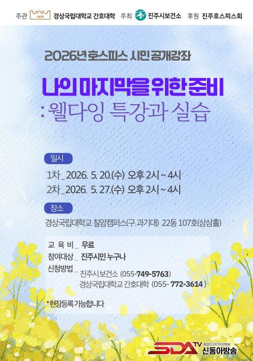 [½Åµ¿¾Æ¹æ¼Û °æ³²ÁøÁÖ=³²±Ã¿µ±â±âÀÚ] ÁøÁÖ½Ã¿Í °æ»ó±¹¸³´ë °£È£´ëÇÐÀº ¡®³ªÀÇ ¸¶Áö¸·À» À§ÇÑ Áغñ¡¯¸¦ ÁÖÁ¦·Î ¿À´Â 5¿ù 20Àϰú 5¿ù 27ÀÏ °æ»ó±¹¸³´ë Ä¥¾ÏÄ·ÆÛ½º(¿¾. °æ³²°úÇбâ¼ú´ë) 22µ¿ 107È£(»ï»ïȦ)¿¡¼­ ¡®È£½ºÇǽº ½Ã¹Î °ø°³°­Á¡¯¸¦ ½Ç½ÃÇÑ´Ù.