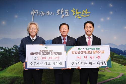 [½Åµ¿¾Æ¹æ¼Û ÇÔ¾È=À̽ŵ¿±âÀÚ]Çö´ëÀü±â(ÁÖ) ³ªÈñ¿í ´ëÇ¥¿Í Ãæ¹«¼­Á¡ ¼­¼®Å ´ëÇ¥´Â 17ÀÏ ÇԾȱºÃ»À» ¹æ¹®ÇØ ÀÎÀç ¾ç¼ºÀ» À§ÇÑ ÀåÇбâ±Ý 2000¸¸ ¿ø°ú 500¸¸ ¿øÀ» °¢°¢ ÇԾȱº ÀåÇÐÀç´Ü¿¡ ±âŹ Çß´Ù. À̳¯ ±âŹ½Ä¿¡ ³ªÈñ¿í ´ëÇ¥¿Í ¼­¼®Å ´ëÇ¥°¡ Âü¼®ÇØ Áö¿ªÀÇ ±³À° ¡¦