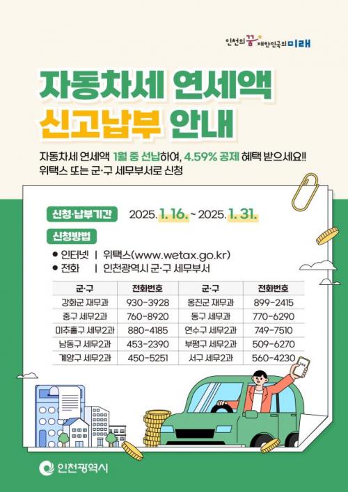 [½Åµ¿¾Æ¹æ¼Û ÀÎõ= À±¹Î½Ä±âÀÚ] ÀÎõ±¤¿ª½Ã(½ÃÀå À¯Á¤º¹)´Â ÀÌ´Þ 31ÀϱîÁö ÀÚµ¿Â÷¼¼ ¿¬¼¼¾× ³³ºÎ ½ÅûÀ» ¹Þ´Â´Ù°í ¹àÇû´Ù. ÀÚµ¿Â÷¼¼´Â ¸Å³â 6¿ù°ú 12¿ù µÎ Â÷·Ê ºÎ°úµÇÁö¸¸, ¿¬¼¼¾×À» 1¿ù¿¡ ¼±³³ÇÏ¸é °øÁ¦ ÇýÅÃÀ» ¹ÞÀ» ¼ö ÀÖ´Ù. ½Åû ±â°£Àº 1¿ù ¸»±îÁöÀ̸ç, ¿¬¡¦