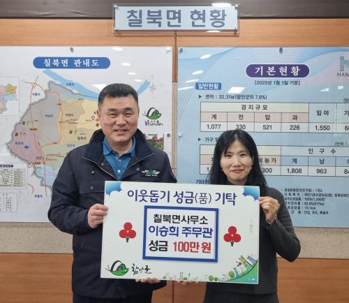 [½Åµ¿¾Æ¹æ¼Û °æ³²ÇÔ¾È=À̽ŵ¿±âÀÚ] ÇԾȱº Ä¥ºÏ¸é»ç¹«¼Ò¿¡ ±Ù¹«ÇÏ´Â À̽ÂÈñ ÁÖ¹«°üÀÌ Ä¥ºÏ¸é¿¡ ÀÌ¿ôµ½±â ¼º±Ý 100¸¸ ¿øÀ» ±âŹÇϸ鼭 ¸íÀýÀ» ¾ÕµÎ°í ÈÆÈÆÇÑ ³ª´® ºÐÀ§±â¸¦ À̾°í ÀÖ´Ù. À̳¯ ±âŹµÈ ¼º±ÝÀº °æ³²»çȸº¹Áö°øµ¿¸ð±Ýȸ¸¦ ÅëÇØ Ä¥ºÏ¸é ¾î·Á¿î °¡±¸¿¡ Àü´ÞµÉ¡¦