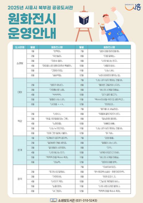 [½Åµ¿¾Æ¹æ¼Û ½ÃÈï½Ã=À̽ŵ¿±âÀÚ] ½ÃÈï½Ã ºÏºÎ±Ç °ø°øµµ¼­°üÀº Áö¿ªÁֹε鿡°Ô ±×¸²Ã¥ ¿øÈ­¸¦ ÅëÇØ ¹®Çаú ¿¹¼úÀÇ °¡Ä¡¸¦ Àü´ÞÇϰí, µµ¼­°üÀ» ´Ü¼øÈ÷ ÀÚ·á Á¦°ø °ø°£À» ³Ñ¾î ¿¹¼ú°ú ¹®È­Àû °æÇèÀ» °øÀ¯ÇÏ´Â Àå¼Ò·Î È®ÀåÇϰíÀÚ ¡®¿øÈ­ Àü½Ã¡¯¸¦ ¿î¿µÇÑ´Ù. ¿øÈ­ Àü½Ã´Â¡¦