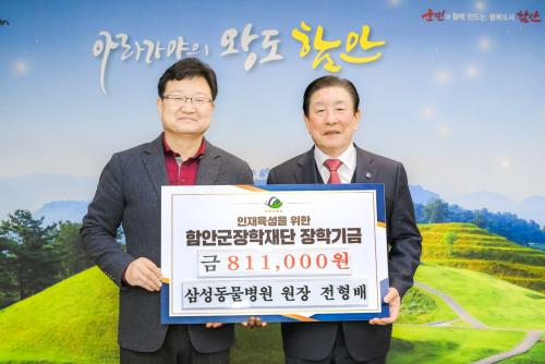 [½Åµ¿¾Æ¹æ¼Û °æ³²ÇÔ¾È=À̽ŵ¿±âÀÚ] ÇԾȱºÀº »ï¼ºµ¿¹°º´¿ø ÀüÇü¹è ¿øÀåÀº 24ÀÏ ¿ÀÀü ±ºÃ»À» ¹æ¹®ÇØ Áö¿ªÀÎÀç À°¼ºÀ» À§ÇÑ ÀåÇбâ±Ý 81¸¸ 1000¿øÀ» ±âŹÇß´Ù. À̳¯ ±âŹ½Ä¿¡¼­ ÀüÇü¹è ¿øÀåÀº ¡°ÇлýµéÀÌ Èñ¸ÁÀ» ÀÒÁö ¾Ê°í °Ç°­ÇÑ »çȸ±¸¼º¿øÀ¸·Î ¼ºÀåÇÏ±æ ¹Ù¶ó´Â ¸¶¡¦