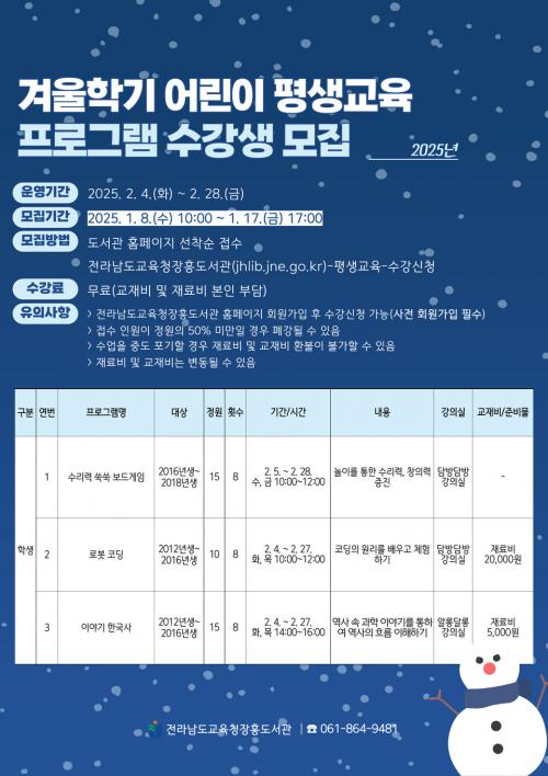 [½Åµ¿¾Æ¹æ¼Û Àü³²ÀåÈï=À̽ŵ¿±âÀÚ] Àü¶ó³²µµ±³À°Ã»ÀåÈïµµ¼­°üÀº °Ü¿ï¹æÇÐÀ» ¸Â¾Æ ´Ù¾çÇÑ ±³À° ±âȸ¸¦ Á¦°øÇϰíÀÚ ¿À´Â 2¿ù 4ÀÏ(È­)ºÎÅÍ °Ü¿ïÇб⠾ÀÌ Æò»ý±³À° ÇÁ·Î±×·¥À» ¿î¿µÇÑ´Ù. À̹ø °Ü¿ïÇб⿡´Â ¼ö¸®·Â ¾¦¾¦ º¸µå°ÔÀÓ(1~3Çгâ), ·Îº¿ ÄÚµù(3~6Çгâ), À̾ߡ¦