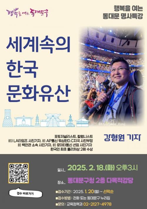 [½Åµ¿¾Æ¹æ¼Û µ¿´ë¹®±¸=À̽ŵ¿±âÀÚ] ¼­¿ï µ¿´ë¹®±¸°¡ Çѱ¹ÀÎ ÃÖÃʷΠǽ¸®Ã³»óÀ» 2ȸ ¼ö»óÇÑ °­Çü¿ø ±âÀڷκÎÅÍ ¡®¼¼°è ¼ÓÀÇ Çѱ¹ ¹®È­À¯»ê¡¯¿¡ ´ëÇÑ À̾߱⸦ µè´Â Ưº°ÇÑ ½Ã°£À» ¸¶·ÃÇß´Ù. 2¿ùÀÇ ¸í»ç·Î ÃʺùµÈ °­Çü¿ø ±âÀÚ´Â LA ŸÀÓ½º, AP Åë½Å, ·ÎÀÌÅÍ Åë½Å µî ¹Ì±¹¡¦