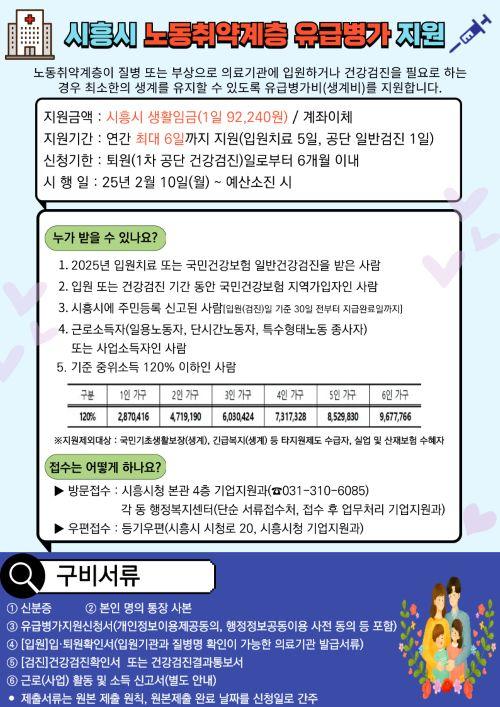 [½Åµ¿¾Æ¹æ¼Û ½ÃÈï½Ã=À̽ŵ¿±âÀÚ] ½ÃÈï½Ã°¡ ¡®2025³â ³ëµ¿Ãë¾à°èÃþ À¯±Þº´°¡ Áö¿ø»ç¾÷¡¯À» 2¿ù 10ÀϺÎÅÍ ½ÃÇàÇÑ´Ù. ÇØ´ç »ç¾÷Àº ³ëµ¿Ãë¾à°èÃþÀÌ Áúº´¡¤ºÎ»ó µîÀ¸·Î ÀÎÇØ ÀÇ·á±â°ü¿¡ ÀÔ¿øÇϰųª ±¹¹Î°Ç°­º¸Çè »ó ÀϹݰǰ­°ËÁøÀ» ¹Þ¾Æ ¹ß»ýÇÏ´Â ¼Òµæ °ø¹éÀ» ¿ÏÈ­Çϱâ À§¡¦