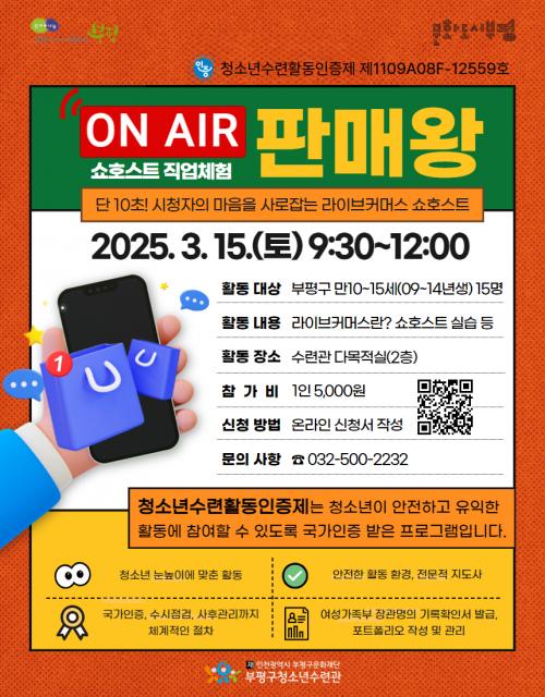 ºÎÆò±¸Ã»¼Ò³â¼ö·Ã°ü, û¼Ò³â¼ö·ÃȰµ¿ ÀÎÁõÇÁ·Î±×·¥ ¡®ON AIR ÆÇ¸Å¿Õ!¡¯ Âü°¡ÀÚ ¸ðÁý