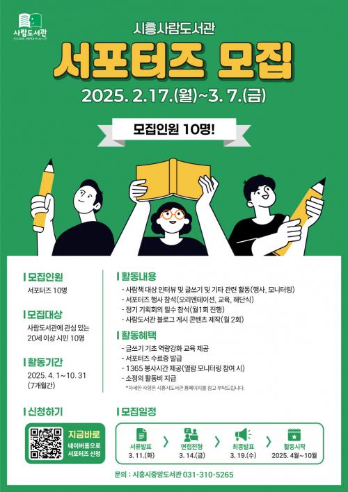 [½Åµ¿¾Æ¹æ¼Û ½ÃÈï½Ã=À̽ŵ¿±âÀÚ] ½ÃÈï½Ã Áß¾Óµµ¼­°üÀº »ç¶÷µµ¼­°ü »ç¾÷À» È«º¸ÇÏ°í ºÐ¾ßº° »ç¶÷Ã¥ ÄÜÅÙÃ÷ Á¦ÀÛÀ» À§ÇØ ¡®»ç¶÷µµ¼­°ü 3±â ¼­Æ÷ÅÍÁî(ÀÌÇÏ, ¼­Æ÷ÅÍÁî)¡¯¸¦ ¸ðÁýÇÑ´Ù. ¼­Æ÷ÅÍÁî ¸ðÁýÀº 2¿ù 17ÀϺÎÅÍ 3¿ù 7ÀϱîÁö 3ÁÖ°£ ÁøÇàµÇ¸ç, »ç¶÷µµ¼­°ü¿¡ °üÇÑ °ü½É°ú¡¦