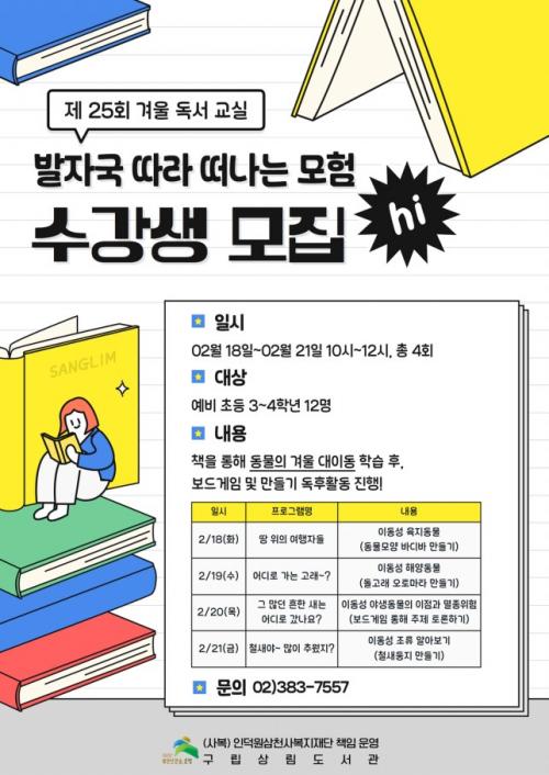 [½Åµ¿¾Æ¹æ¼Û ÀºÆò±¸=À̽ŵ¿±âÀÚ] ÀºÆò±¸´Â ±¸¸³»ó¸²µµ¼­°üÀÌ Á¦25ȸ °Ü¿ï µ¶¼­ ±³½Ç ¡®¹ßÀÚ±¹ µû¶ó ¶°³ª´Â ¸ðÇè¡®À» ¿î¿µÇÑ´Ù°í ¹àÇû´Ù. À̹ø °Ü¿ï µ¶¼­ ±³½ÇÀº ¿À´Â 21ÀϱîÁö ÁøÇàµÈ´Ù. µ¶¼­¸¦ ÅëÇØ ´Ù¾çÇÑ »ýÅ ȯ°æ¿¡¼­ »ì¾Æ°¡´Â À̵¿¼º ¾ß»ýµ¿¹°¿¡ ´ëÇØ ¾Ë¾Æº¸°í¡¦