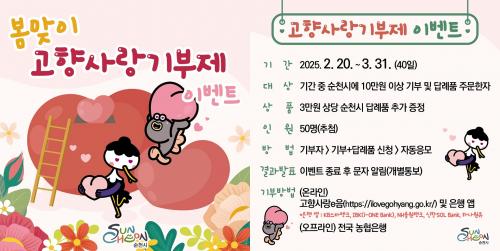 [½Åµ¿¾Æ¹æ¼Û ¼øÃµ=±è¿ëÈÆ ±âÀÚ] ¼øÃµ½Ã(½ÃÀå ³ë°ü±Ô)´Â ´Ù°¡¿À´Â º½À» ¸Â¾Æ ¡®¼øÃµ °íÇâ»ç¶û±âºÎÁ¦ º½¸ÂÀÌ Æ¯º° À̺¥Æ®¡¯¸¦ ¿À´Â 3¿ù 31ÀϱîÁö ÁøÇàÇÑ´Ù°í ¹àÇû´Ù. À̺¥Æ® ±â°£ µ¿¾È ¼øÃµ½Ã¿¡ 10¸¸ ¿ø ÀÌ»ó ±âºÎÇÏ°í ´ä·Êǰ ÁÖ¹®±îÁö ¿Ï·áÇÑ ±âºÎÀÚ´Â ÀÚµ¿À¸·Î ÀÀ¸ð¡¦