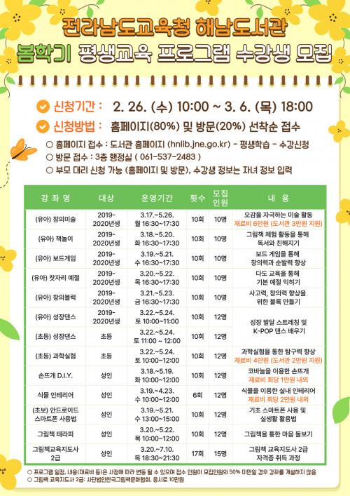 [½Åµ¿¾Ð¾Æ¼Û Àü³²Çس²=À̽ŵ¿±âÀÚ] Àü¶ó³²µµ±³À°Ã»Çس²µµ¼­°ü¿¡¼­´Â 2025³â 3¿ù 17ÀϺÎÅÍ 7¿ù 10ÀϱîÁö 2025³â º½ÇÐ±â Æò»ý±³À° ÇÁ·Î±×·¥À» ¿î¿µÇÑ´Ù. ÇÁ·Î±×·¥Àº [ÀÚ°ÝÁõ] ±×¸²Ã¥±³À°Áöµµ»ç 2±Þ, (À¯¾Æ) âÀǹ̼ú, (À¯¾Æ) Ã¥³îÀÌ, (À¯¾Æ) º¸µå°ÔÀÓ, (À¯¾Æ, ÃÊ¡¦