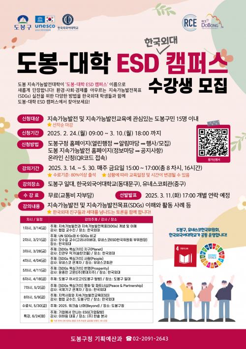 [½Åµ¿¾Æ¹æ¼Û µµºÀ±¸=À̽ŵ¿±âÀÚ] µµºÀ±¸°¡ 'µµºÀ-´ëÇÐ ESD Ä·ÆÛ½º'(±¸ µµºÀÁö¼Ó°¡´É¹ßÀü´ëÇÐ) »ó¹Ý±â ¼ö°­»ýÀ» ¸ðÁýÇÑ´Ù. µµºÀ-´ëÇÐ ESD Ä·ÆÛ½º´Â ȯ°æ, »çȸ, °æÁ¦ µî ¿©·¯ ºÐ¾ß¿¡¼­ Áö¼Ó°¡´É¹ßÀü¸ñÇ¥(SDGs)¸¦ ½ÇõÇϱâ À§ÇÑ °®°¡Áö ¹æ¹ýÀ» ¾Ë¾Æº¸´Â ÇÁ·Î±×·¥ÀÌ´Ù.¡¦
