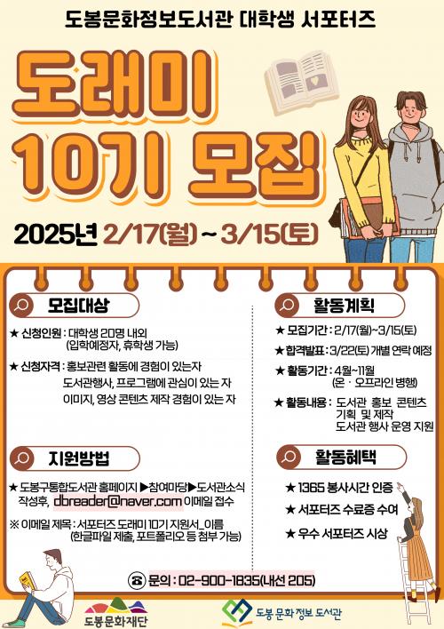 [½Åµ¿¾Æ¹æ¼Û µµºÀ±¸=À̽ŵ¿±âÀÚ] µµºÀ±¸ µµºÀ¹®È­Á¤º¸µµ¼­°üÀÌ ´ëÇлý ¼­Æ÷ÅÍÁî ¡®µµ·¡¹Ì 10±â¡¯¸¦ 3¿ù 15ÀϱîÁö ¸ðÁýÇÑ´Ù. ¡®µµ¼­°ü¿¡ ¿À´Â ¾Æ¸§´Ù¿î »ç¶÷µé¡¯À̶ó´Â Àǹ̸¦ °¡Áø µµ·¡¹Ì ¼­Æ÷ÅÍÁî´Â 2015³âµµºÎÅÍ ¿î¿µÇØ ¿ÃÇØ·Î 10³â°¸¦ ¸ÂÀÌÇÏ´Â µµ¼­°ü ´ëÇ¥ ´ëÇС¦