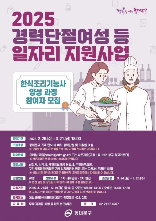 [½Åµ¿¾Æ¹æ¼Û µ¿´ë¹®±¸=À̽ŵ¿±âÀÚ] ¼­¿ï µ¿´ë¹®±¸´Â °æ·Â ´ÜÀý ¹× ¹ÌÃë¾÷ ¿©¼ºÀ» ´ë»óÀ¸·Î ÇѽÄÁ¶¸®±â´É»ç ¾ç¼º °úÁ¤ ±³À°»ýÀ» ¸ðÁýÇÑ´Ù. ±¸´Â ¹ÌÃë¾÷ ¿©¼ºÀÇ Ãë¾÷ ±âȸ È®´ë¸¦ À§ÇØ ¿¬ 2ȸ ¡®°æ·Â´ÜÀý¿©¼º µî ÀÏÀÚ¸® Áö¿ø»ç¾÷¡¯À» ¿î¿µÇϰí ÀÖ´Ù. À̹ø °úÁ¤¿¡¼­´Â ¡¦
