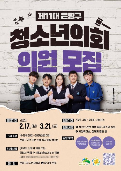 [½Åµ¿¾Æ¹æ¼Û ÀºÆò±¸=À̽ŵ¿±âÀÚ] ÀºÆò±¸´Â ¿À´Â 21ÀϱîÁö ¡®Á¦11´ë ÀºÆò±¸ û¼Ò³âÀÇȸ¡¯ ÀÇ¿ø°ú û³â ¸àÅ並 ¸ðÁýÇÑ´Ù°í ¹àÇû´Ù. Á¦11´ë ÀºÆò±¸ û¼Ò³âÀÇȸ ÀÇ¿øÀº Çб³Ãßõ°ú °ø°³¸ðÁýÀ» ÅëÇØ 30¸í ³»¿Ü·Î ±¸¼ºµÉ ¿¹Á¤ÀÌ´Ù. ÀºÆò±¸¿¡ °ÅÁÖÇϰųª ÀºÆò±¸¿¡ ¼ÒÀçÇÑ Áß¡¦