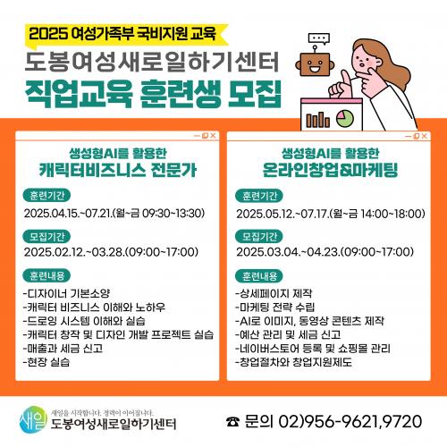 [½Åµ¿¾Æ¹æ¼Û µµºÀ±¸=À̽ŵ¿±âÀÚ] µµºÀ±¸°¡ Ãë‧â¾÷À» Èñ¸ÁÇÏ´Â ¿©¼ºÀ» À§ÇØ ¿©¼º°¡Á·ºÎ Áö¿ø»ç¾÷À¸·Î Á÷¾÷±³À° ÈÆ·Ã°úÁ¤À» ¿î¿µÇÑ´Ù. ¿ÃÇØ »ó¹Ý±â¿¡ ¿î¿µÇÏ´Â °úÁ¤Àº ¡®»ý¼ºÇü AI¸¦ Ȱ¿ëÇÑ Ä³¸¯ÅÍ ºñÁî´Ï½º Àü¹®°¡¡¯ °úÁ¤°ú ¡®»ý¼ºÇü AI¸¦ Ȱ¿ëÇÑ ¿Â¶óÀΠâ¾÷ ¡¦