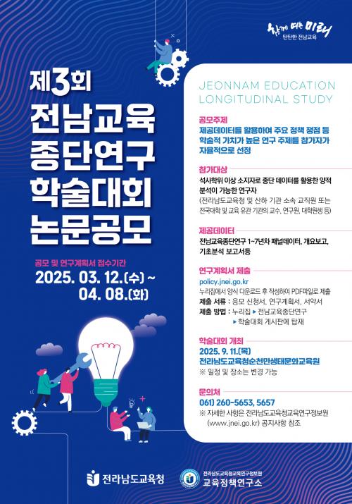 [½Åµ¿¾Æ¹æ¼Û Àü³²=À̽ŵ¿±âÀÚ] Àü¶ó³²µµ±³À°Ã»±³À°¿¬±¸Á¤º¸¿øÀº Àü³²±³À°ÀÇ ¹ßÀüÀ» À§ÇÑ Çй®Àû ¿¬±¸¸¦ Ȱ¼ºÈ­ÇÏ°í ¹Ì·¡ ±³À°Á¤Ã¥ ¼ö¸³¿¡ ÇÊ¿äÇÑ ±Ù°Å ÀڷḦ Á¦°øÇϰíÀÚ¡®Á¦3ȸ Àü³²±³À°Á¾´Ü¿¬±¸ Çмú´ëȸ¡¯ ³í¹® °ø¸ð¸¦ ½Ç½ÃÇÑ´Ù. À̹ø Çмú´ëȸ´Â 2018³âºÎÅÍ 2024¡¦