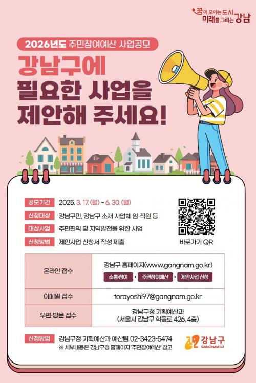 [½Åµ¿¾Æ¹æ¼Û °­³²±¸=À̽ŵ¿±âÀÚ] ²ÞÀÌ ¸ðÀÌ´Â µµ½Ã, ¹Ì·¡¸¦ ±×¸®´Â °­³²±¸°¡ 3¿ù 17ÀϺÎÅÍ 6¿ù 30ÀϱîÁö 2026³âµµ ¿¹»êÆí¼º¿¡ ¹Ý¿µÇÒ ÃÑ 20¾ï ±Ô¸ðÀÇ ÁÖ¹ÎÂü¿©¿¹»ê Á¦¾È»ç¾÷ °ø¸ð¸¦ ÁøÇàÇÑ´Ù. °ø¸ð ÁÖÁ¦´Â ¡®ÁֹΠÆíÀÍ ¹× Áö¿ª ¹ßÀüÀ» À§ÇÑ »ç¾÷¡¯ÀÌ¸ç °­³²±¸¹ÎÀ» ºñ¡¦