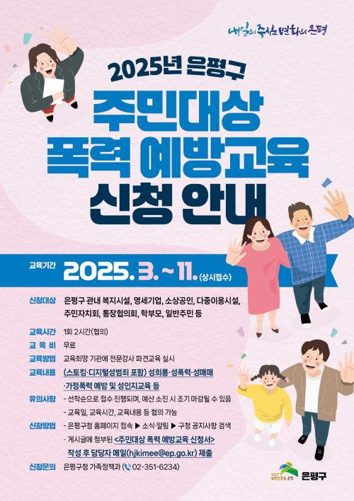 [½Åµ¿¾Æ¹æ¼Û ÀºÆò±¸=À̽ŵ¿±âÀÚ] ÀºÆò±¸´Â Áö¿ª»çȸ ³» ¼ºÆòµî ÀǽÄÀ» °³¼±ÇÏ°í ¾ÈÀüÇÑ »çȸ ºÐÀ§±â¸¦ Á¶¼ºÇϰíÀÚ ¡®ÁֹΠ´ë»ó Æø·Â ¿¹¹æ±³À°¡¯À» ½Ç½ÃÇÑ´Ù°í ¹àÇû´Ù. ±³À°Àº °ü³» º¹Áö½Ã¼³, ¿µ¼¼±â¾÷, ¼Ò»ó°øÀÎ, Çкθð ¸ðÀÓ, µ¿ Á÷´É´Üü µî 5ÀÎ ÀÌ»óÀÇ ±â°ü ¶Ç´Â ¡¦