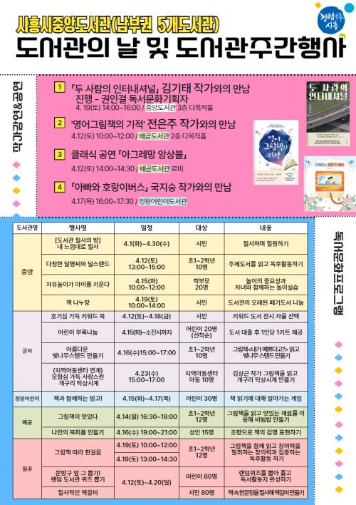 [½Åµ¿¾Æ¹æ¼Û ½ÃÈï½Ã=À̽ŵ¿±âÀÚ] ½ÃÈï½ÃÁß¾Óµµ¼­°üÀº ¿À´Â 4¿ù 12ÀϺÎÅÍ 18ÀϱîÁö ¡®µµ¼­°üÀÇ ³¯¡¯ ¹× ¡®µµ¼­°ü ÁÖ°£¡¯À» ¸Â¾Æ ½Ã¹ÎµéÀ» À§ÇÑ ´Ùä·Î¿î µ¶¼­¹®È­Çà»ç¸¦ ÁøÇàÇÑ´Ù. ¿ÃÇØÀÇ ÁÖÁ¦´Â ¡®²ÞÀ» Ű¿ì´Â ¾¾¾Ñ, µµ¼­°ü¿¡ ¹¯´Ù¡¯·Î, µµ¼­°üÀÇ ³¯(4¿ù 12ÀÏ) ¹× ¡®¡¦