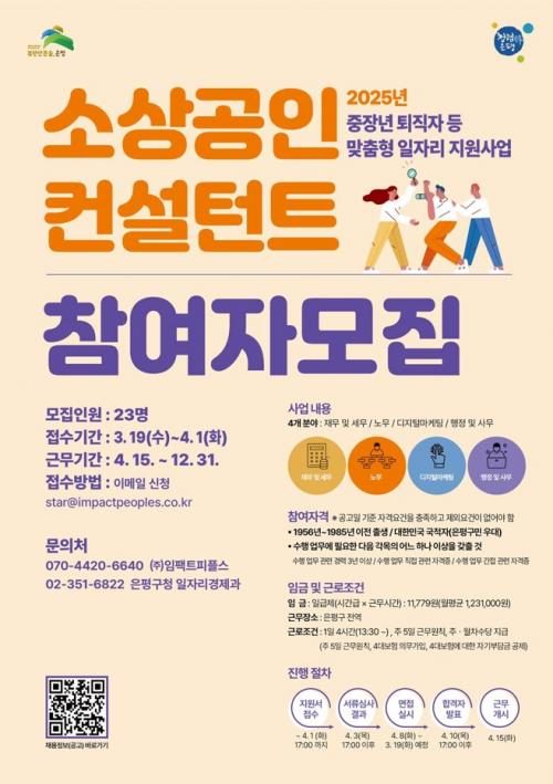 [½Åµ¿¾Æ¹æ¼Û ÀºÆò±¸=À̽ŵ¿±âÀÚ] ÀºÆò±¸´Â ¡®ÁßÀå³â »õÃâ¹ß ÅðÁ÷ÀÚ µî ¸ÂÃãÇü ÀÏÀÚ¸® Áö¿ø»ç¾÷¡¯¿¡ Âü¿©ÇÒ ¼Ò»ó°øÀÎ ÄÁ¼³ÅÏÆ® Âü¿©ÀÚ¸¦ ³»´Þ 1ÀϱîÁö ¸ðÁýÇÑ´Ù°í ¹àÇû´Ù. ¡®ÁßÀå³â »õÃâ¹ß ÅðÁ÷ÀÚ µî ¸ÂÃãÇü ÀÏÀÚ¸® Áö¿ø¡¯Àº ¹Î¼± 8±â °ø¾à »ç¾÷À¸·Î °æ·ÂÀ» °¡Áø ÁßÀ塦