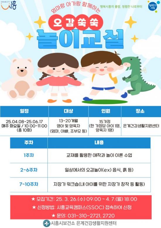 [½Åµ¿¾Æ¹æ¼Û ½ÃÈï½Ã=À̽ŵ¿±âÀÚ] ½ÃÈï½Ãº¸°Ç¼Ò Àº°è°Ç°­»ýȰÁö¿ø¼¾ÅÍ´Â 4¿ù 8ÀϺÎÅÍ 13~20°³¿ù ¿µ¤ýÀ¯¾Æ ´ë»óÀ¸·Î ¾çÀ°ÀÚ¿Í ÇÔ²²ÇÏ´Â ¡®¾ö¸¶¶û ¾Æ°¡¶û ¿À°¨ ¾¦¾¦ ³îÀÌ ±³½Ç¡¯À» ¿î¿µÇÑ´Ù. ¿µÀ¯¾Æ¿Í ºÎ¸ð¸¦ ´ë»óÀ¸·Î ÁøÇàµÇ´Â À̹ø ±³À°°úÁ¤Àº ½ÃÈï½Ã ³îÀÌȰµ¿°¡ÀÎ Çá¦