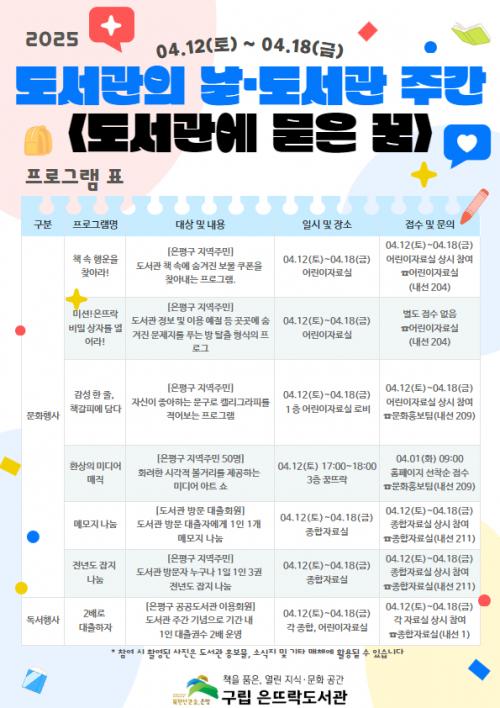[½Åµ¿¾Æ¹æ¼Û ÀºÆò±¸=À̽ŵ¿±âÀÚ] ÀºÆò±¸´Â ±¸¸³ Àº¶ß¶ôµµ¼­°ü¿¡¼­ µµ¼­°üÀÇ ³¯¡¤µµ¼­°ü ÁÖ°£À» ±â³äÇØ ¡®²ÞÀ» Ű¿ì´Â ¾¾¾Ñ, µµ¼­°ü¿¡ ¹¯´Ù¡¯¸¦ ÁÖÁ¦·Î ¹®È­Çà»ç¿Í µ¶¼­ Çà»ç¸¦ ÁøÇàÇÑ´Ù°í ¹àÇû´Ù. µµ¼­°üÀÇ ³¯¡¤µµ¼­°ü ÁÖ°£ Çà»ç´Â Áö¿ªÁֹο¡°Ô µµ¼­°üÀÇ Á߿伺°ú ÇÊ¡¦
