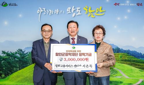 [½Åµ¿¾Æ¹æ¼Û °æ³²ÇÔ¾È=À̽ŵ¿±âÀÚ] ¼­Àºµæ Ä¥¿ø °í¿ë¼­ºñ½º ¼¾ÅÍÀåÀº Áö³­ 2ÀÏ ÇԾȱºÀåÇÐÀç´ÜÀ» ¹æ¹®ÇØ Áö¿ªÀÎÀç À°¼ºÀ» À§ÇÑ ÀåÇбâ±Ý 300¸¸ ¿øÀ» ±âŹÇß´Ù. À̳¯ ±âŹ½Ä¿¡´Â Á¶±ÙÁ¦ ÇԾȱº¼ö¸¦ ºñ·ÔÇØ ¼­Àºµæ ¼¾ÅÍÀå°ú ¹è¿ìÀÚ ¿À±ÝÃÊ´Ô, ¾È»óÁÖ ÇԾȱº »ê¸²Á¶ÇÕÀ塦