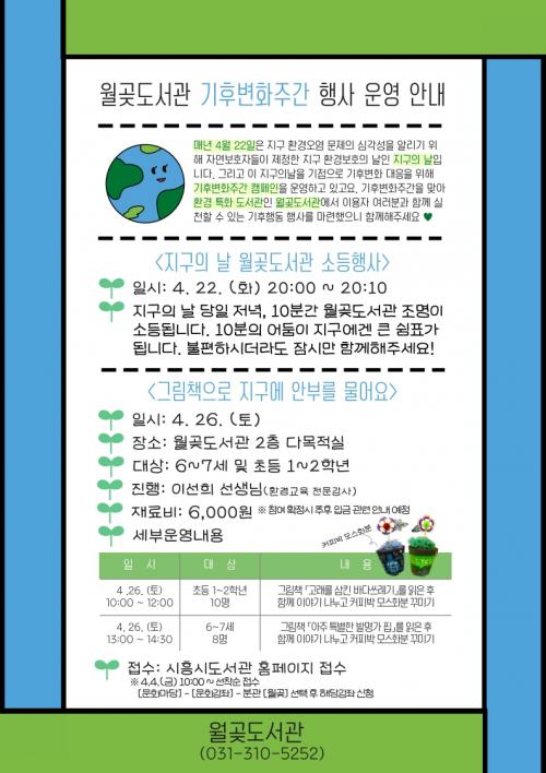 [½Åµ¿¾Æ¹æ¼Û ½ÃÈï½Ã=À̽ŵ¿±âÀÚ] ½ÃÈï½ÃÀÇ È¯°æ Ưȭ µµ¼­°üÀÎ ¿ù°ùµµ¼­°üÀÌ ¡®Áö±¸ÀÇ ³¯(4¿ù 22ÀÏ)¡¯°ú ¡®±âÈĺ¯È­ÁÖ°£¡¯À» ¸Â¾Æ »ýȰ ¼Ó Áö±¸¸¦ À§ÇÑ ½ÇõÀ» ÁÖÁ¦·Î ȯ°æ °ü·Ã Çà»ç¸¦ ¿î¿µÇÑ´Ù. ¿ù°ùµµ¼­°üÀº ¡®È¯°æ¡¯À» ÁÖÁ¦·Î Áö¼ÓÀûÀ¸·Î Àå¼­ È®Ãæ, ÇÁ·Î±×·¥ ¿î¡¦