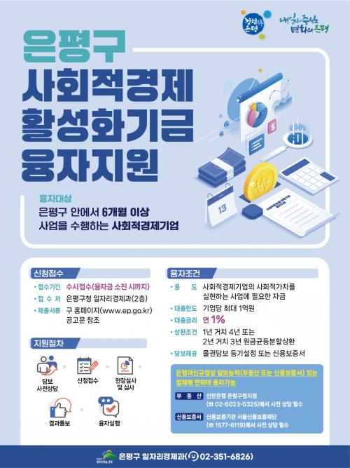 [½Åµ¿¾Æ¹æ¼Û ÀºÆò±¸=À̽ŵ¿±âÀÚ] ¼­¿ï ÀºÆò±¸´Â »çȸÀû°æÁ¦±â¾÷ÀÇ È¿°úÀûÀÎ ¼ºÀå Áö¿øÀ» À§ÇØ ÃÑ 5¾ï ¿ø ±Ô¸ðÀÇ »çȸÀû°æÁ¦È°¼ºÈ­±â±Ý À¶ÀÚ Áö¿øÀ» È®´ëÇÑ´Ù°í ¹àÇû´Ù. ±¸´Â »çȸÀû°æÁ¦±â¾÷ÀÌ Àü³âµµ ¸ÅÃâ¾×ÀÇ 35% ³»¿¡¼­¸¸ À¶ÀÚ¸¦ ½ÅûÇÒ ¼ö ÀÖ¾ú´ø Á¦ÇÑÀ» ¾ø¾Ö°í, ¡¦