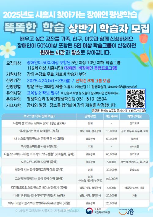 [½Åµ¿¾Æ¹æ¼Û ½ÃÈï½Ã=À̽ŵ¿±âÀÚ] ½ÃÈï½Ã´Â ¼ºÀÎ Àå¾ÖÀÎÀÇ ÇнÀ Á¢±Ù¼ºÀ» ³ôÀ̰í, Áö¿ª ³» Æò»ýÇнÀ ±âȸ¸¦ È®´ëÇϱâ À§ÇØ Ã£¾Æ°¡´Â Àå¾ÖÀÎ Æò»ýÇнÀ ÇÁ·Î±×·¥ ¡®¶È¶ÈÇÑ ÇнÀ¡¯ »ó¹Ý±â ÇнÀÀÚ¸¦ 4¿ù 24ÀϺÎÅÍ 28ÀϱîÁö ¸ðÁýÇÑ´Ù. ¡®¶È¶ÈÇÑ ÇнÀ¡¯Àº 2025³â ½Å±Ô»ç¾÷À¸¡¦