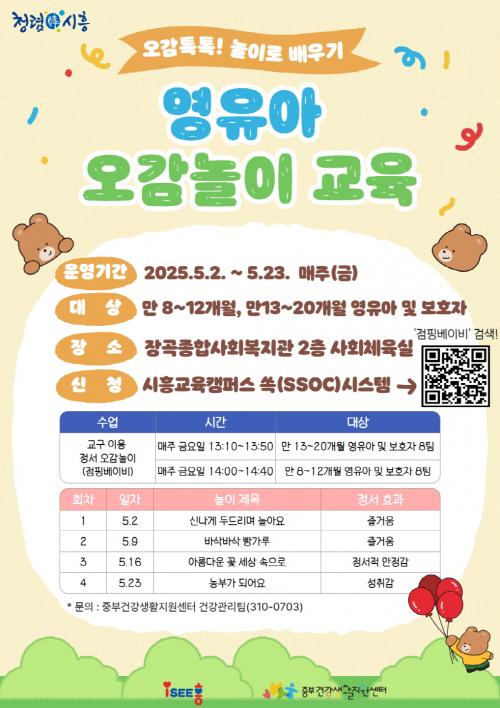 [½Åµ¿¾Æ¹æ¼Û ½ÃÈï½Ã=À̽ŵ¿±âÀÚ] ½ÃÈï½Ã Áߺΰǰ­»ýȰÁö¿ø¼¾ÅÍ´Â °ü³» ¿µÀ¯¾ÆÀÇ °Ç°­ÇÑ ¼ºÀå°ú ¹ß´ÞÀ» µ½±â À§ÇØ ¿µÀ¯¾Æ ¿À°¨³îÀÌ ±³À°ÀÎ ¡®¿À°¨ ÅåÅå! ³îÀÌ·Î ¹è¿ì±â¡¯¸¦ ¿À´Â 5¿ù 2ÀϺÎÅÍ 5¿ù 23ÀϱîÁö ¸ÅÁÖ ±Ý¿äÀÏ ÃÑ 4ȸ¿¡ °ÉÃÄ ¿î¿µÇÑ´Ù. À̹ø ±³À°Àº ¸¸ 8~12°³¡¦