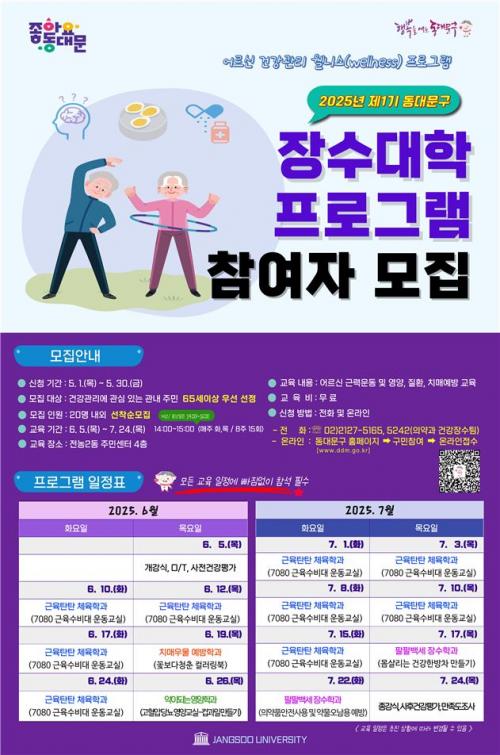 [½Åµ¿¾Æ¹æ¼Û µ¿´ë¹®±¸=À̽ŵ¿±âÀÚ] ¼­¿ï µ¿´ë¹®±¸´Â ¾î¸£½ÅµéÀÇ °Ç°­ÇÑ ³ëÈÄ»ýȰÀ» Áö¿øÇϰíÀÚ ¿îµ¿, ¿µ¾ç, Ä¡¸Å ¿¹¹æ µîÀÇ ³»¿ëÀ» Æ÷ÇÔÇÑ ¡®µ¿´ë¹®±¸ Àå¼ö´ëÇС¯ ÇÁ·Î±×·¥À» ¿î¿µÇÑ´Ù. À̹ø ÇÁ·Î±×·¥Àº ±¸°¡ ¡®2025³â ¼­¿ï½Ã °Ç°­Àå¼ö¼¾ÅÍ ÀÚÄ¡±¸ °ø¸ð¡¯¿¡ ¼±Á¤µÇ¸é¡¦