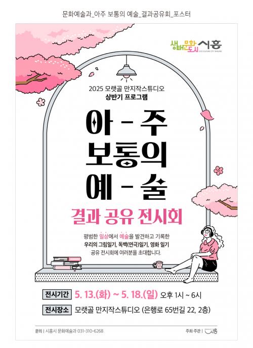 [½Åµ¿¾Æ¹æ¼Û ½ÃÈï½Ã=À̽ŵ¿±âÀÚ] ½ÃÈï½Ã´Â 2025 ¹®È­Àç»ý°ø°£ ¸ð·§°ñ ¸¸ÁöÀÛ½ºÆ©µð¿À »ó¹Ý±â ÇÁ·Î±×·¥ ¡®¾ÆÁÖ º¸ÅëÀÇ ¿¹¼ú¡¯ÀÇ °á°ú °øÀ¯È¸ Àü½Ãȸ¸¦ ¿À´Â 5¿ù 13ÀϺÎÅÍ 18ÀϱîÁö ¸ð·§°ñ ¸¸ÁöÀÛ ½ºÆ©µð¿À(ÀºÇà·Î 65¹ø±æ 22, 2Ãþ)¿¡¼­ °³ÃÖÇÑ´Ù. ¸ð·§°ñ ¸¸ÁöÀÛ½ºÆ©µð¿À¡¦