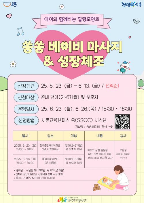 [½Åµ¿¾Æ¹æ¼Û ½ÃÈï½Ã=À̽ŵ¿±âÀÚ] ½ÃÈï½Ã Áߺΰǰ­»ýȰÁö¿ø¼¾ÅÍ´Â ¿µ¾ÆÀÇ °Ç°­ÇÑ ¼ºÀå°ú º¸È£ÀÚÀÇ ¾çÀ° ¿ª·® °­È­¸¦ À§ÇØ ¿À´Â 6¿ù 23Àϰú 26ÀÏ¿¡ ¡®½ö½ö º£À̺ñ ¸¶»çÁö&¼ºÀåüÁ¶¡¯ ±³À°À» ¿î¿µÇÑ´Ù. À̹ø ÇÁ·Î±×·¥Àº »ýÈÄ 2°³¿ùºÎÅÍ 6°³¿ù±îÁöÀÇ °ü³» ¿µ¾Æ¿Í º¸È£ÀÚ¸¦¡¦