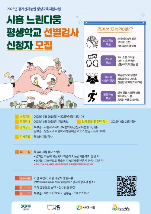 [½Åµ¿¾Æ¹æ¼Û ½ÃÈ蘆=À̽ŵ¿±âÀÚ] ½ÃÈï½Ã´Â °æ°è¼± Áö´ÉÀÎÀ» À§ÇÑ Æò»ý±³À° Áö¿ø»ç¾÷ÀÎ ¡®½ÃÈï ´À¸°´Ù¿ò Æò»ýÇб³¡¯¸¦ ¿î¿µÇÏ°í ¼±º°°Ë»ç Âü¿©ÀÚ¸¦ ¸ðÁýÇÑ´Ù. À̹ø »ç¾÷Àº Á¶±â Áø´ÜÀÌ ÇÊ¿äÇÑ °æ°è¼± Áö´ÉÀÎÀ» ´ë»óÀ¸·Î À¡½½·¯ Áö´É°Ë»ç(¹«·á)¸¦ Áö¿øÇϰí, °Ë»ç °á°ú¡¦