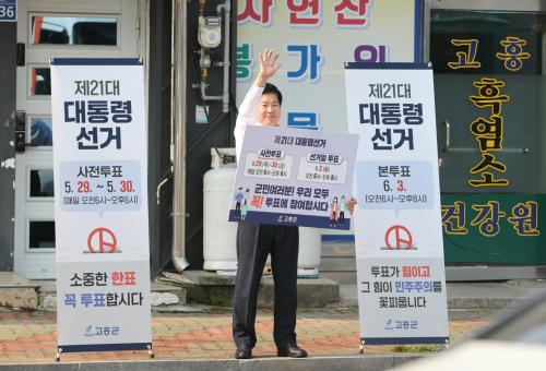 [½Åµ¿¾Æ¹æ¼Û Àü³²°íÈï=¹Ú±¤¿Á±âÀÚ] °ø¿µ¹Î °íÈﱺ¼ö´Â »çÀüÅõÇ¥ ÇÏ·ç ÀüÀÎ 28ÀÏ ¿ÀÀü, °íÈïÀ¾ ÆÄ¸®¹Ù°ÔÆ® ¾Õ ·ÎÅ͸®¿Í ±ºÃ» ¾Õ¿¡¼­ ÅõÇ¥Âü¿©¸¦ µ¶·ÁÇÏ´Â 1ÀÎ ÇÇÄÏ °Å¸® È«º¸¿¡ ³ª¼¹´Ù. °ø¿µ¹Î ±º¼ö´Â ¡®ÅõÇ¥°¡ ÈûÀ̰í, ±× ÈûÀÌ ¹ÎÁÖÁÖÀǸ¦ ²ÉÇÇ¿ó´Ï´Ù¡¯, ¡®±º¹Î ¿©·¯¡¦