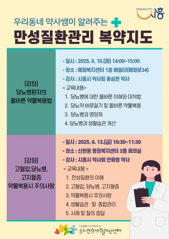 [½Åµ¿¾Æ¹æ¼Û ½ÃÈï½Ã=À̽ŵ¿±âÀÚ] ½ÃÈï½Ã Áߺΰǰ­»ýȰÁö¿ø¼¾ÅÍ´Â Áö¿ª ÁֹΠ¸¸¼ºÁúȯ ¿¹¹æ°ü¸®¸¦ À§ÇÑ ¿Ã¹Ù¸¥ º¹¾àÁöµµ °Ç°­°­Á¸¦ ¿À´Â 6¿ù µÎ Â÷·Ê¿¡ °ÉÃÄ ½Ç½ÃÇÑ´Ù. À̹ø °­Á´ ½ÃÈï½Ã ¾à»çȸ ¼Ò¼Ó ¾à»ç°¡ Á÷Á¢ °­ÀÇÇϸç, ´ç´¢º´, °íÇ÷¾Ð, °íÁöÇ÷Áõ µî ´ëÇ¥ÀûÀÎ ¡¦