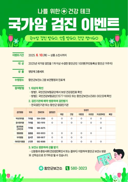 [½Åµ¿¾Æ¹æ¼Û °æ³²ÇÔ¾È=À̽ŵ¿±âÀÚ] ÇԾȱºº¸°Ç¼Ò´Â 6¿ù 10ÀϺÎÅÍ »óǰ¼ÒÁø½Ã±îÁö, 2025³â ±¹°¡¾Ï °ËÁø ¼ö°ËÀÚ¸¦ ´ë»óÀ¸·Î ¡®³ª¸¦ À§ÇÑ °Ç°Å×Å©, ±¹°¡¾Ï °ËÁø¡¯ À̺¥Æ®¸¦ ½Ç½ÃÇÑ´Ù°í ¹àÇû´Ù. ÇØ´ç À̺¥Æ® Âü¿©¹æ¹ýÀº ±¹°¡¾Ï °ËÁø 6°³(À§¾Ï, °£¾Ï, ´ëÀå¾Ï, À¯¹æ¾Ï, ÀÚ¡¦