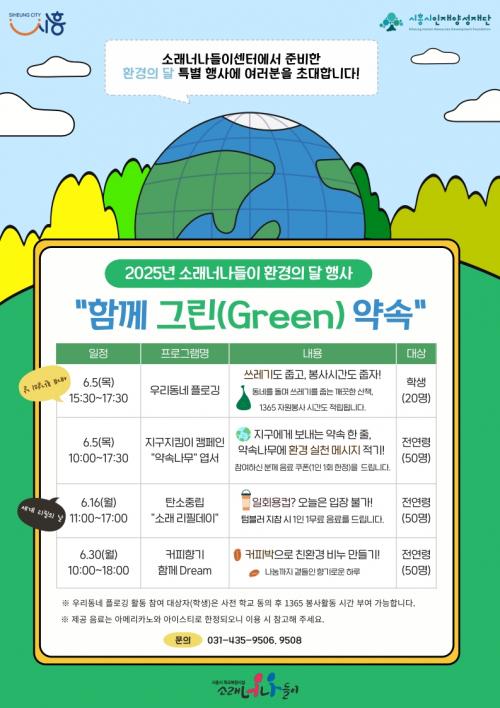 [½Åµ¿¾Æ¹æ¼Û ½ÃÈï½Ã=À̽ŵ¿±âÀÚ] (Àç)½ÃÈï½ÃÀÎÀç¾ç¼ºÀç´Ü Çб³º¹Çսü³ ¼Ò·¡³Ê³ªµéÀ̼¾ÅͰ¡ 6¿ù 5ÀϺÎÅÍ 30ÀϱîÁö Áö¿ªÁÖ¹ÎÀ» ´ë»óÀ¸·Î ¡®ÇÔ²² ±×¸°(Green) ¾à¼Ó¡¯ Çà»ç¸¦ ¿î¿µÇÑ´Ù. À̹ø Çà»ç´Â ÀÏȸ¿ëǰ ÁÙÀ̱â, ÀÚ¿ø¼øÈ¯, ȯ°æÁ¤È­ µî ´Ù¾çÇÑ ÁÖÁ¦·Î ±¸¼ºµÆÀ¸¸ç, ¡¦