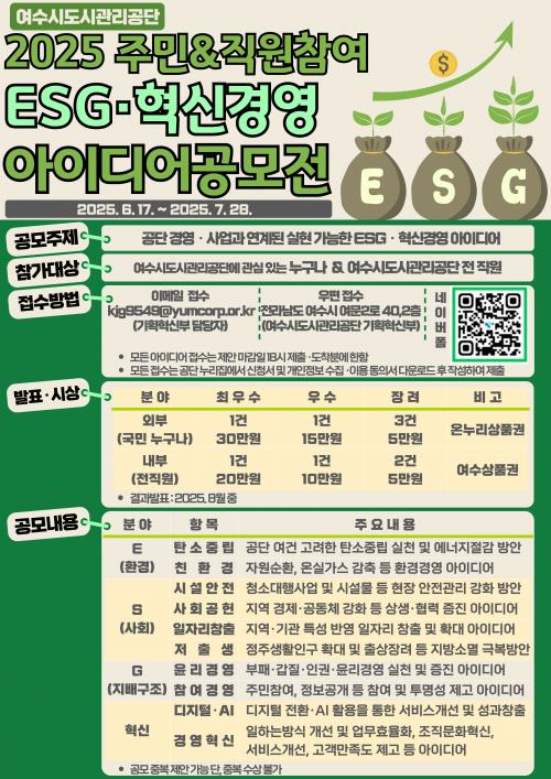 [½Åµ¿¾Æ¹æ¼ÛÀü³²¿©¼ö=±è±â³² ±âÀÚ] ¿©¼ö½Ãµµ½Ã°ü¸®°ø´Ü(ÀÌ»çÀå ±èÀ¯È­)Àº âÀÇÀûÀ̰í Çõ½ÅÀûÀÎ °úÁ¦¸¦ ¹ß±¼Çϰí, ÁÖ¹ÎÂü¿©°æ¿µÀ» °­È­Çϱâ À§ÇØ ¡®ESG¡¤Çõ½Å°æ¿µ ¾ÆÀ̵ð¾î¡¯ °ø¸ðÀüÀ» °³ÃÖÇÑ´Ù°í ¹àÇû´Ù. °ø¸ð´Â 7¿ù 28ÀϱîÁö¸ç, °ø´Ü ´©¸®Áý¿¡ ¿Ã¶ó¿Â Á¦¾È¼­¸¦ ¡¦