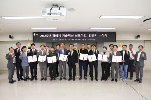 [½Åµ¿¾Æ¹æ¼Û °æ³²±èÇØ=³²±Ã¿µ±â±âÀÚ] ±èÇØ½Ã´Â 17ÀÏ ½Ãû ¼ÒȸÀǽǿ¡¼­ ±èÇØ Àü·«»ê¾÷°ú ¹Ì·¡±â¹Ý»ê¾÷À» À̲ø 2025 ±èÇØÇü ±â¼úÇõ½Å ¼±µµ±â¾÷ 8°³»ç¿¡ ÀÎÁõ¼­¸¦ ¼ö¿©Çß´Ù. ½Ã´Â À̳¯ ÀÎÁõ¼­, ÇöÆÇ ¼ö¿©¿Í ÇÔ²² ¼±Á¤ ±â¾÷ ÃàÇϸ¦ À§ÇØ Âü¼®ÇÑ °æ³²Áö¹æÁß¼Òº¥Ã³±â¾÷û¡¦