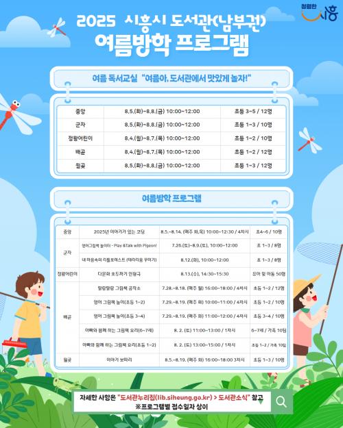 [½Åµ¿¾Æ¹æ¼Û ½ÃÈï½Ã=À̽ŵ¿±âÀÚ] ½ÃÈï½ÃÁß¾Óµµ¼­°üÀ» ºñ·ÔÇÑ 5°³ ³²ºÎ±Ç °ø°øµµ¼­°ü(Áß¾Ó¤ý±ºÀÚ¤ýÁ¤¿Õ¾î¸°À̤ý¹è°ð¤ý¿ù°ù)¿¡¼­ 7¿ù 26ÀϺÎÅÍ 8¿ù 19ÀϱîÁö 2025³â ¿©¸§¹æÇÐ µ¶¼­±³½Ç ¹× ¿©¸§¹æÇÐ ÇÁ·Î±×·¥À» ¿î¿µÇÑ´Ù. À̹ø ÇÁ·Î±×·¥Àº ¾î¸°À̵éÀÌ Ã¥°ú °¡±î¿öÁö´Â¡¦
